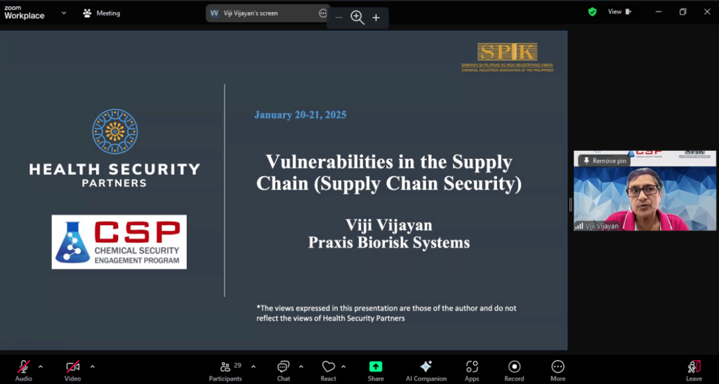The recent 2-day webinar titled “Strengthening Chemical Security Sustainment within Southeast Asia’s Small and Medium Chemical Enterprises: Chemical Security in Supply Chain” concluded successfully on January 21, 2025. This event was funded by the Health Security Partners and co-organized with the Samahan sa Pilipinas ng mga Industriyang Kimika (SPIK). The virtual gathering aimed to bolster chemical security within the region’s supply chains, particularly focusing on small and medium chemical enterprises.